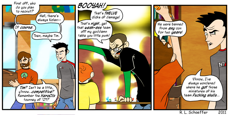 As with Ray, Shaun, and Nolan, Tim is an exaggerated version of the real Tim. Though, I will say that I’ve felt much like a whimpering child sitting on the opposite side of a HeroClix map while he dished out the punishment like Thor wielding Mjolnir.