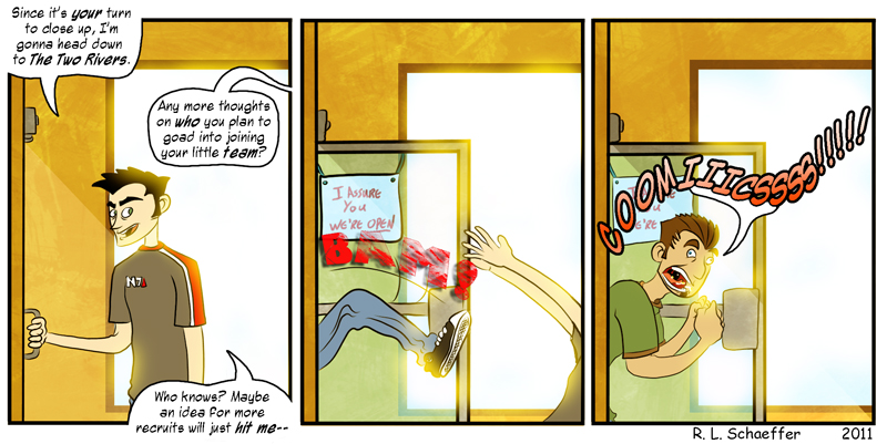 I’m really excited you noticed that, Jillian! Now, if only you wouldn’t make it so I have to torture a Pug…also…The Two Rivers is Nolan’s bar.