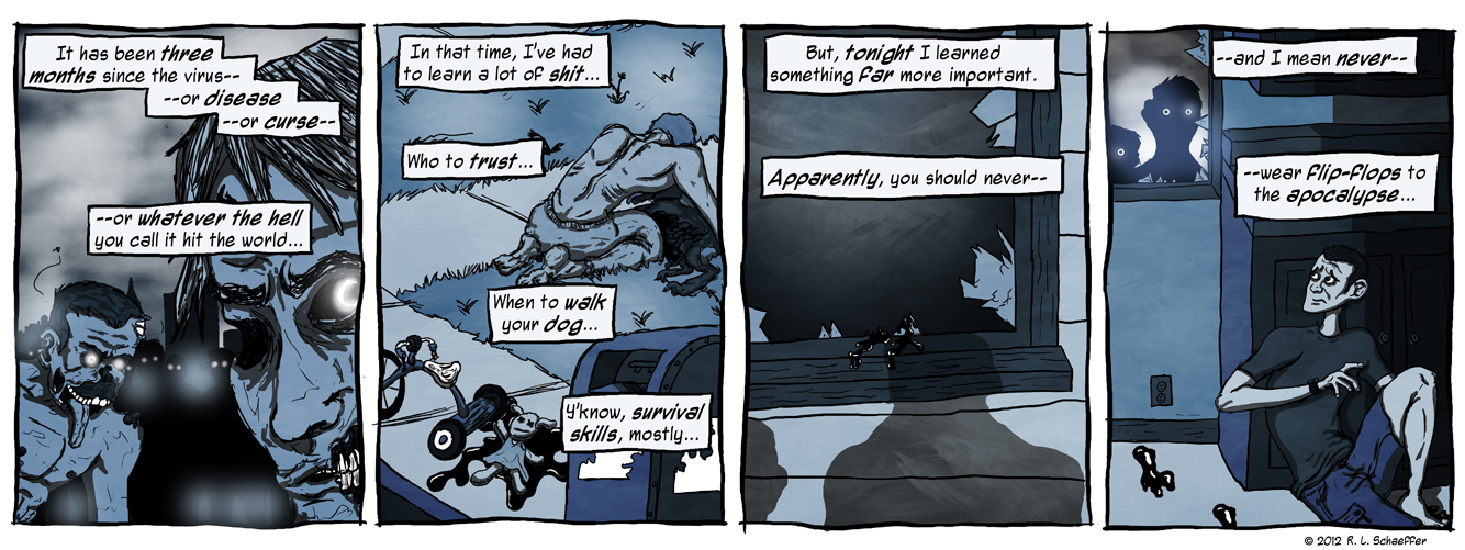 HAHAHAHAHA! Ok, so it was fabulous, and I love the monochrome scheme because it works really well for a horror type strip. But I just can’t get over the “never wear flip flops to the apocalypse” because it’s just more proof of Nate’s claim that flip flops are the most useless shoes ever made.