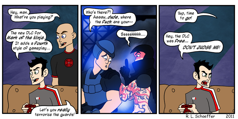 I haven’t played nearly enough of the XBLA hit, Mark of the Ninja, but I have played more than enough to formulate a style of dealing with those pesky armed intruders that would surely…leave it’s mark!